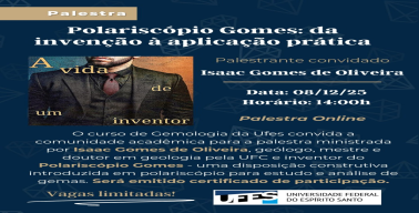 No dia 08/12 (segunda-feira) às 14h haverá a palestra online “Polariscópio Gomes: da invenção à aplicação prática” ministrada por Isaac Gomes de Oliveira, geólogo, mestre e doutor em geologia pela UFC e inventor do Polariscópio Gomes - Disposição construtiva introduzida em polariscópio para estudo e análise de gemas.